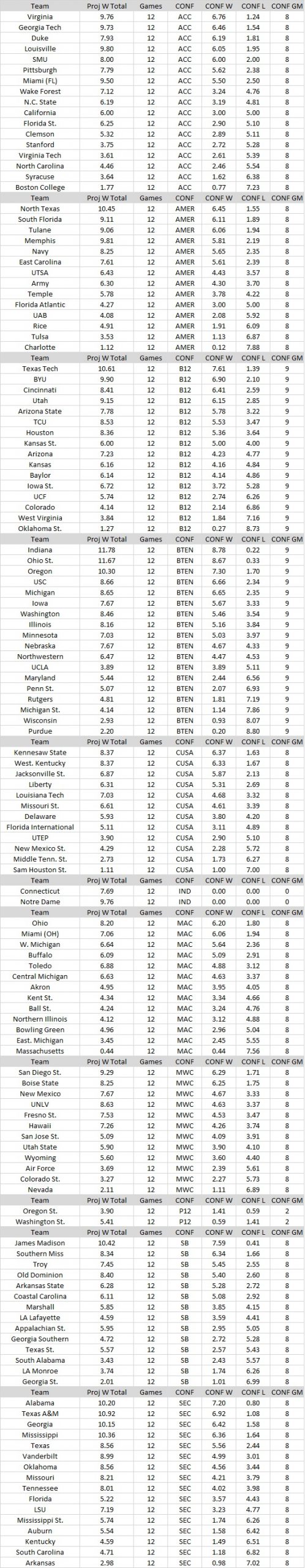 NCAA FB win total projections thru 11/4 games. admin November 5, 2025 Football (Projected win totals for 2025 College Football FBS teams. Overall projected wins on the left, conference wins on the right.)
